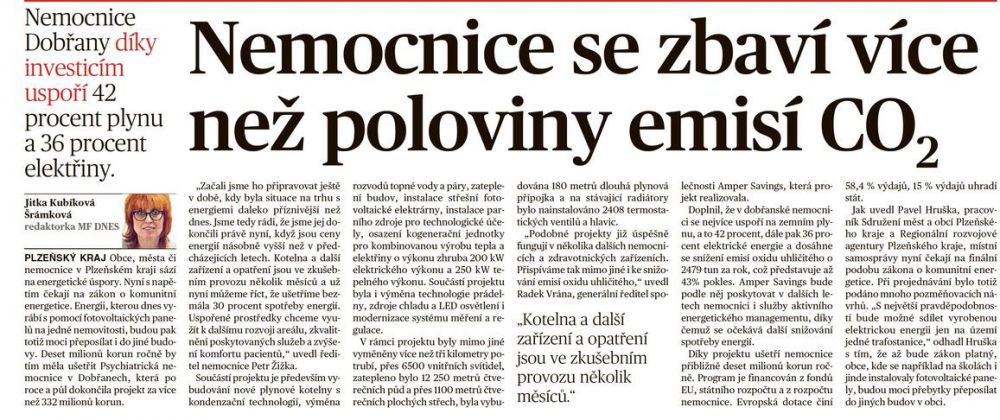 Nemocnice Dobřany díky investicím uspoří 42 procent plynu a 36 procent elektřiny.